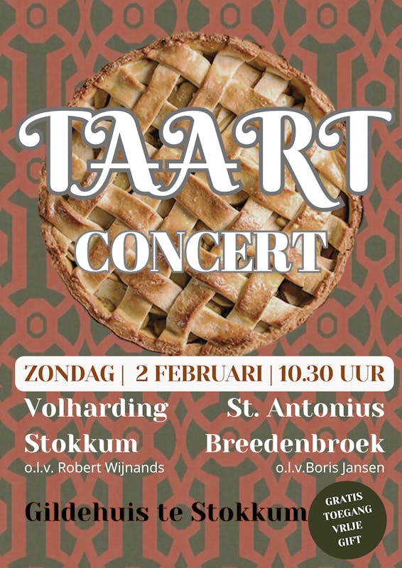 Op zondagmorgen 2 februari geeft Harmonie Volharding samen met St. Antonius uit Breedenbroek een 'taartconcert'. Onder het genot van koffie met taart kunt u tijdens deze morgen genieten van de muzikale klanken van deze verenigingen. Volharding staat onder leiding van Robert Wijnands en Boris Jansen is de dirigent van St. Antonius. Tijdens het concert worden enkele muzikanten gehuldigd voor hun lidmaatschap. William Engelen en Marcha Raayman voor hun 25 jaar, Gabriëlle Wijnands voor haar 40 jaar en Suzan Smit voor haar 50 jaar lidmaatschap.