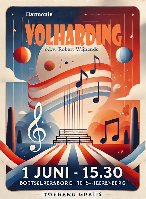 Op zondagmiddag 1 juni brengt Harmonie Volharding onder leiding van dirigent Robert Wijnands, een muzikaal eerbetoon aan de bevrijding van de gemeente Bergh. In de sfeervolle tuin van kasteeltje de Boetselaersborg, in 's-Heerenberg klinkt een luchtig en vrolijk concert dat de vrijheid viert met muziek voor iedereen.