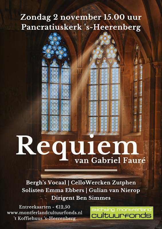 Op zondag 2 november om 15 uur brengen Bergh's Vocaal en CelloWercken Zutphen onder leiding van Ben Simmes het indrukwekkende Requiem van Gabriël Fauré ten gehore. Met solisten Emma Ebbers en Gulian van Nierop.