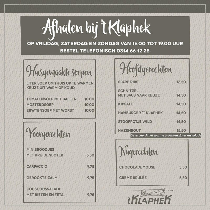 Het nieuwe afhaal menu voor de weekenden biedt genoeg variatie om niet te hoeven koken ! Vanaf zondag 28 november is het 't-Klaphek overdag normaal geopend en 's-avonds nog geopend om af te halen. Op vrijdag, zaterdag en zondag tussen 16.00 en 19.00 uur.
