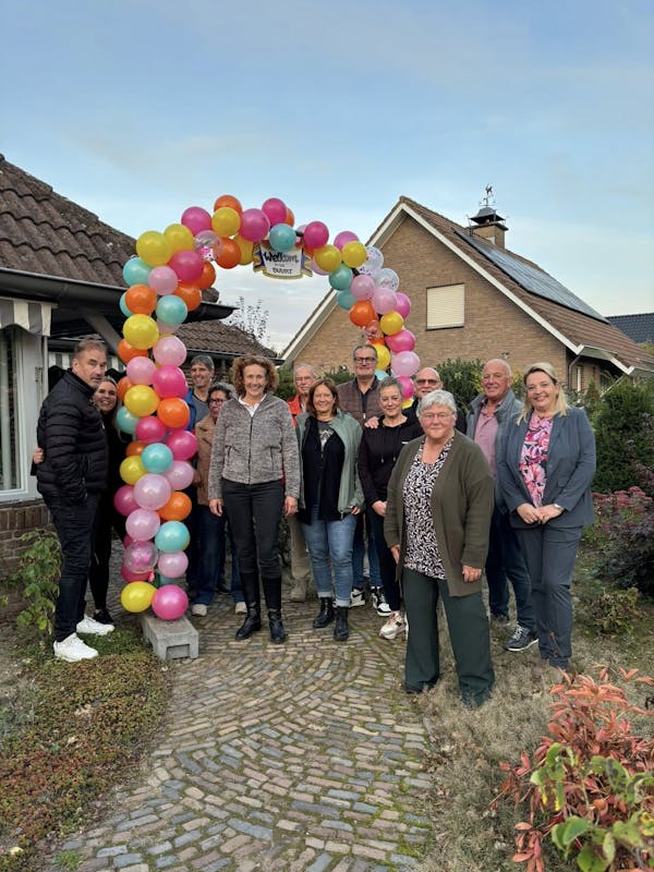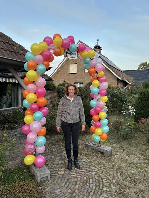 Gisteravond werd Anne-Marie Fellinger welkom geheten in de buurt waar ze sinds kort woont. De directe buurtbewoners aan de Eltenseweg in Stokkum maakten een moderne versie van een boog met groen. Dit keer was de boog van ballonnen. Een van de buurtbewoners had zelfs een prachtig houten bord voor haar gemaakt om op te hangen bij de voordeur.