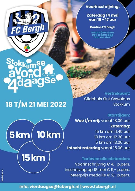 Voorinschrijving is op zaterdag 14 mei van 16:00 tot 17:00 uur in de kantine van FC Bergh. Inschrijven voor de start op woensdag 18 mei is ook mogelijk.