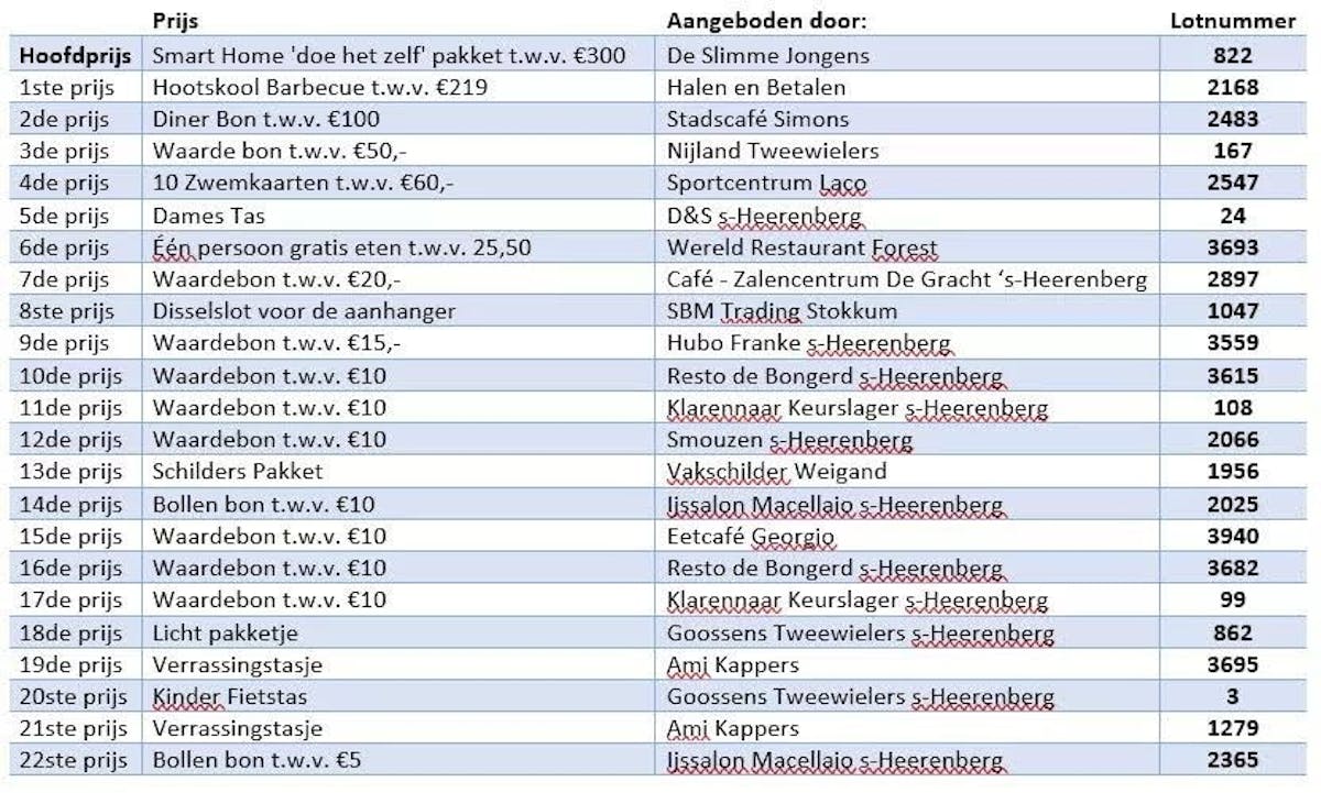 De prijzen zijn op te halen bij Tom Seegers, Rijnlandstraat 6 te Stokkum. Neem voor de tijd even contact met hem op via 0620525896