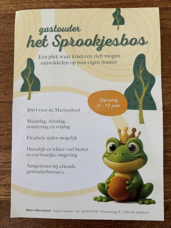 Sophie Jansen opent begin januari 2026 haar eigen Sprookjesbos, aan de Eltenseweg 9 in Stokkum. Als gastouder verzorgt ze dan de opvang voor kinderen van 0 tot 12 jaar. Ze is ook aangesloten bij erkende gastouderbureaus. Sophie heeft haar eigen sprookjeswereld gecreëerd in de aangrenzende woning bij haar thuis vlak bij het bos. Ik zie o.a. al een kikkerkoning en een grote kaboutermuts voor het raam staan. Superleuk. Echt een plek waar kinderen kunnen wegdromen en zich op hun eigen manier mogen ontwikkelen.