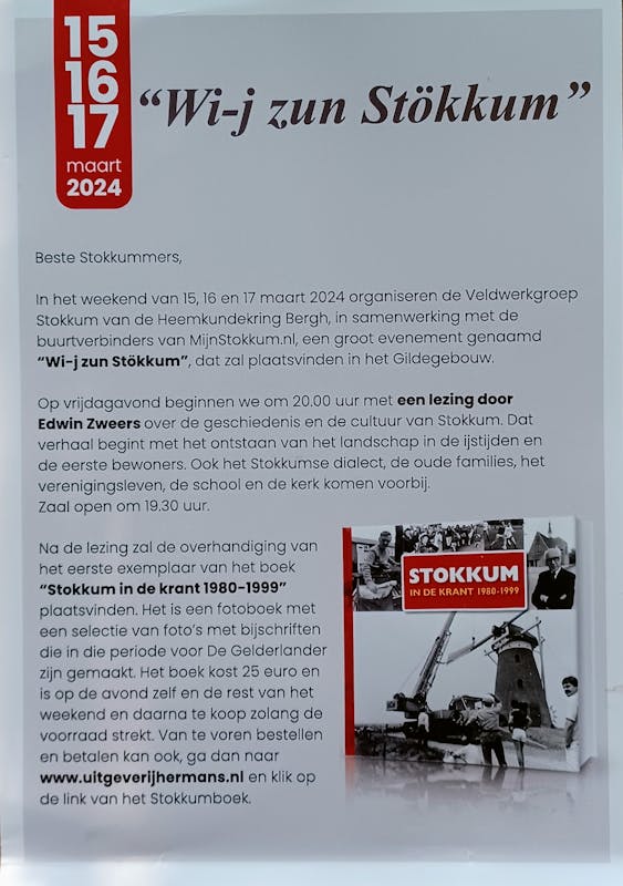 Het programma van dit Stokkumse evenement is nu helemaal bekend. Dus noteer 15, 16 en 17 maart 2024 in je agenda. De Heemkundekring Bergh en de buurtverbinders van MijnStokkum organiseren samen het weekend “Wi-j zun Stökkum”. Gedurende die drie dagen worden er in het Gildehuis tal van zaken rond de geschiedenis en cultuur van ons dorp georganiseerd. Zo staan er een lezing, een pubquiz, enkele tentoonstellingen en het vertonen van oude foto’s en filmpjes en stambomen van Stokkumse families op het programma. Ook zullen tal van Stokkumse verenigingen, organisaties en bedrijven de kans krijgen zich aan het Stokkumse publiek te presenteren. Het weekend is ook bedoeld om de geboren Stokkummers en de nieuwe Stokkummers de kans te bieden elkaar nog wat beter te leren kennen. Verder zal vrijdagavond het eerste exemplaar van het boek “Stokkum in beeld, 1980-2000” worden uitgereikt, een overzicht van foto’s die in die jaren zijn verschenen in De Gelderlander.