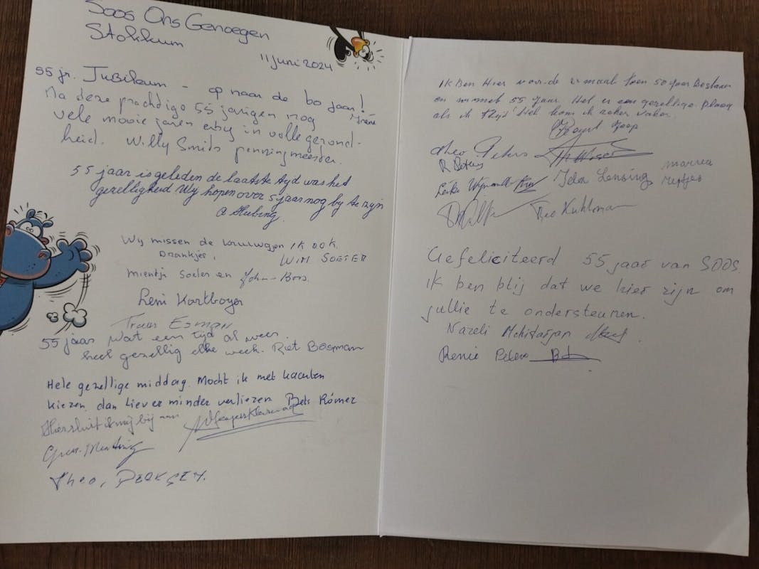 Het 55-jarig jubileum van soos Ons Genoegen werd op dinsdag 11 juni 2024 groots gevierd. Een gezellig samenzijn met 25 aanwezige leden, waarbij de oudste aanwezige maar liefst 94 jaar was.