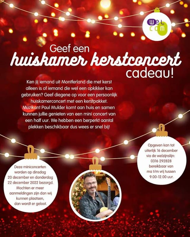 Ken jij iemand uit Montferland, die met kerst alleen is of iemand die wel een opkikker kan gebruiken? Geef diegene op voor een persoonlijk huiskamerconcert met een kerstpakket. Muzikant Paul Mulder komt aan huis en samen kunnen jullie genieten van een mini concert van een half uur.