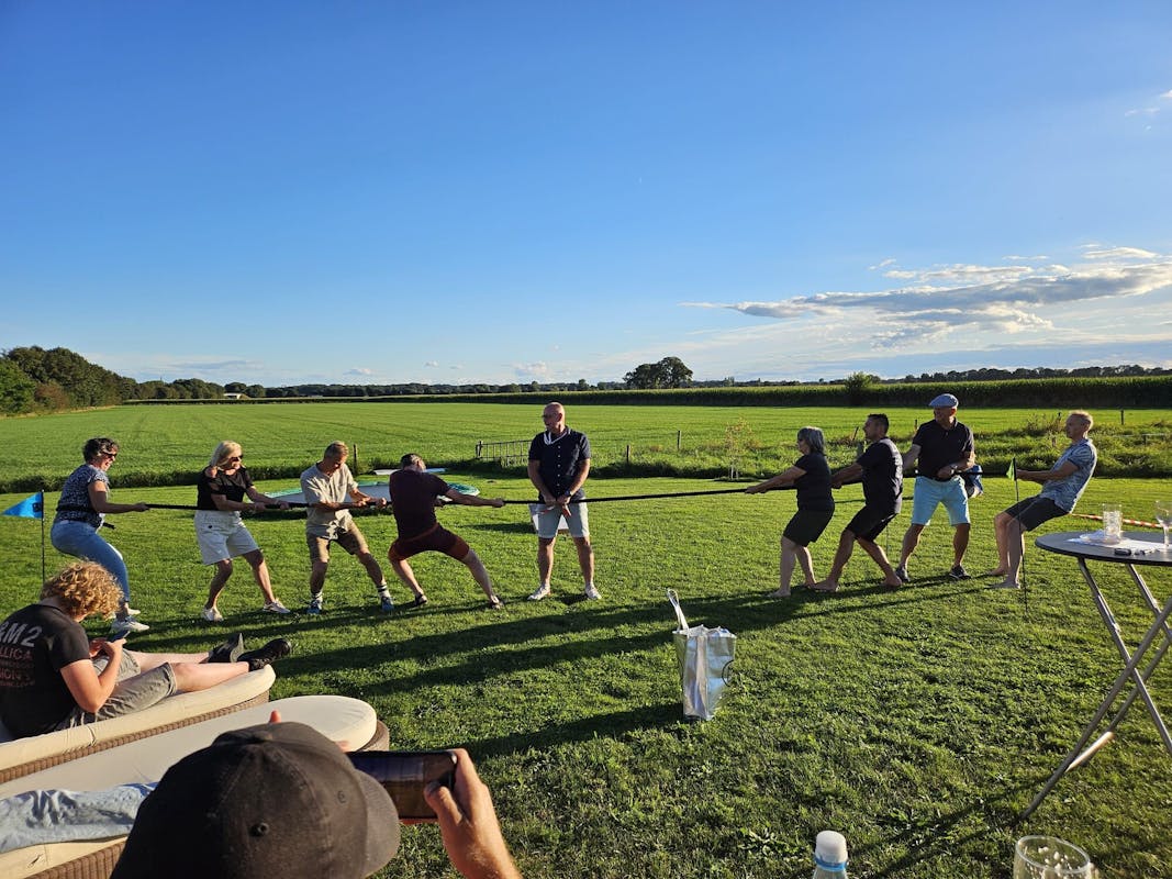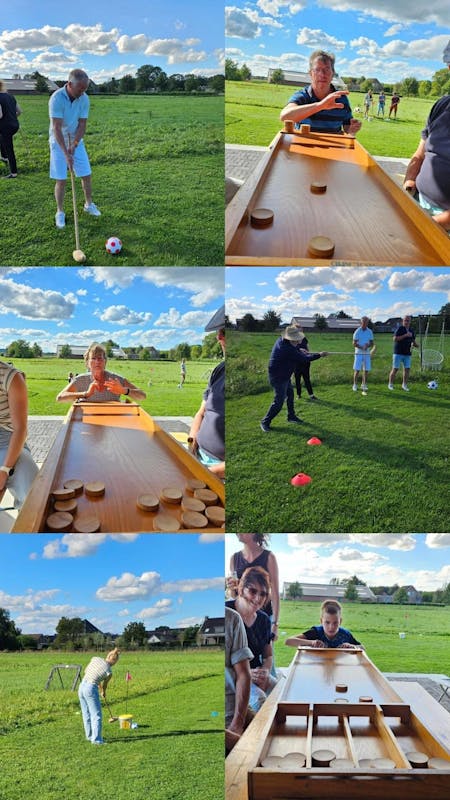 Overal waar je keek, was er iets te doen. Er was boerengolf, waarbij iedereen met veel fanatisme hun best deden om de bal door de hindernissen te slaan. Concentratie bij het sjoelen en een potje jeu de boules. Ter afronding was er de krachtmeting met touwtrekken tussen de teams.