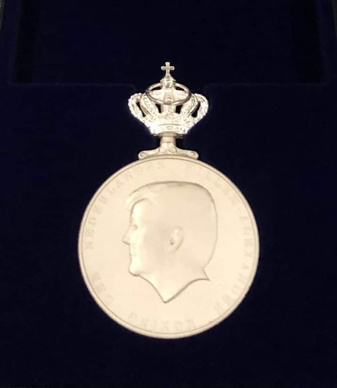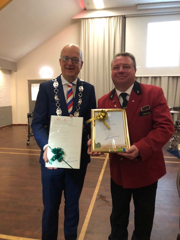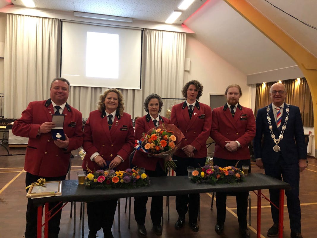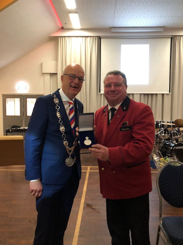 Bij een uniek jubileum hoort iets unieks. Burgemeester Harry de Vries mocht namens Zijne Majesteit Koning Willem Alexander de Koninklijke Erepenning uitreiken aan Harmonie Volharding. Voorzitter Arjan Zweers nam de penning in ontvangst, samen met een oorkonde. Op het podium stond een trots bestuur.
