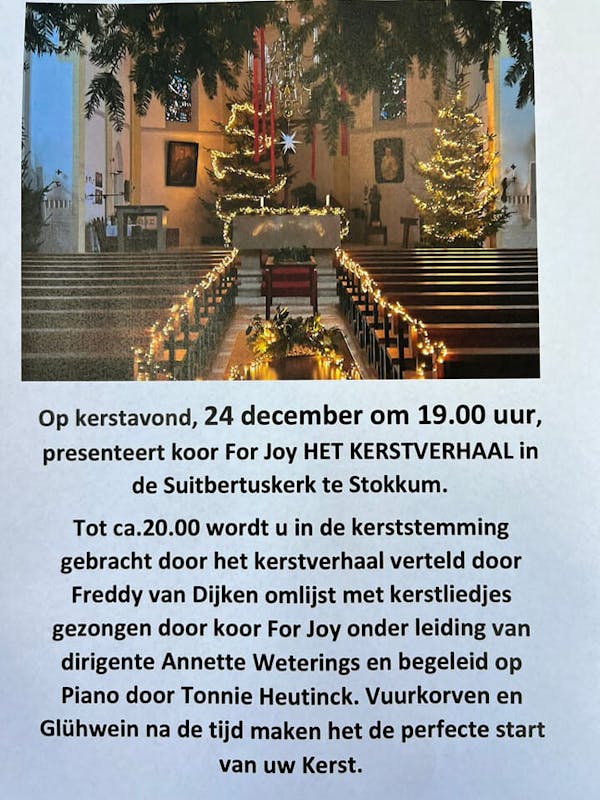 Op kerstavond, 24 december om 19.00 uur presenteert koor For Joy het kerstverhaal in de Suitbertuskerk in Stokkum. Het koor is al weken aan het repeteren met nieuwe kerstliedjes met hun nieuwe dirigente Annette Weterings. Tijdens het kersconcert is er extra muzikale begeleiding op de piano door Tonnie Heutinck. Na afloop zorgen de buurtverbinders van MijnStokkum voor warme glühwein en chocolademelk op het voorplein.
