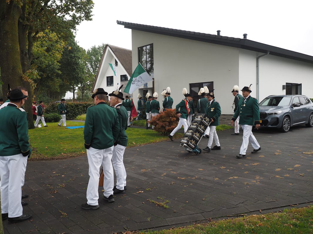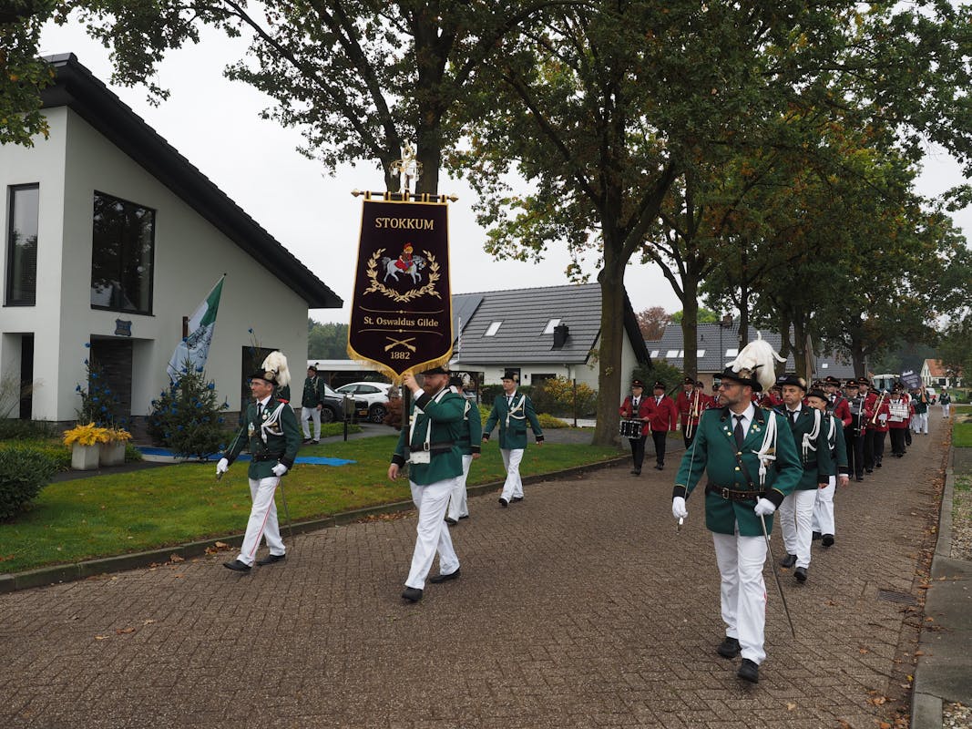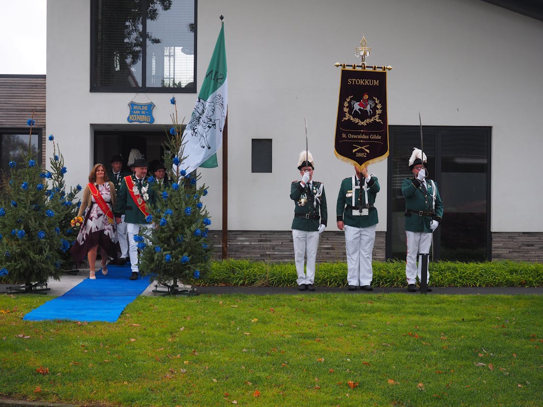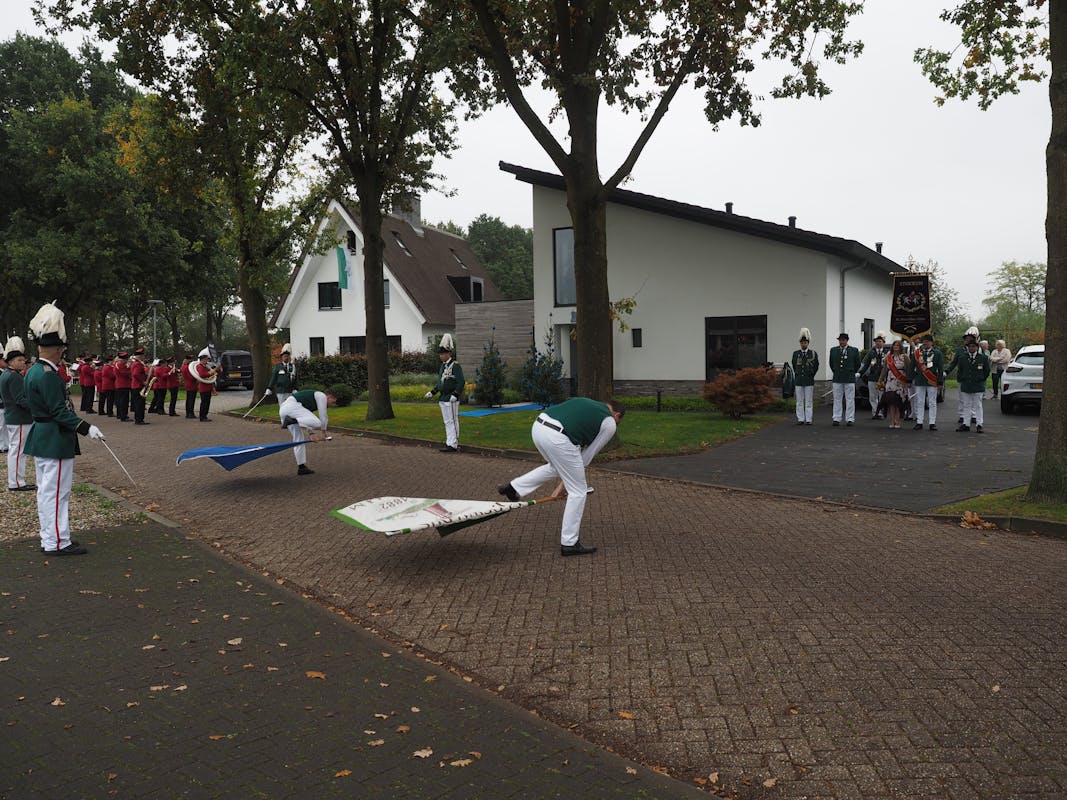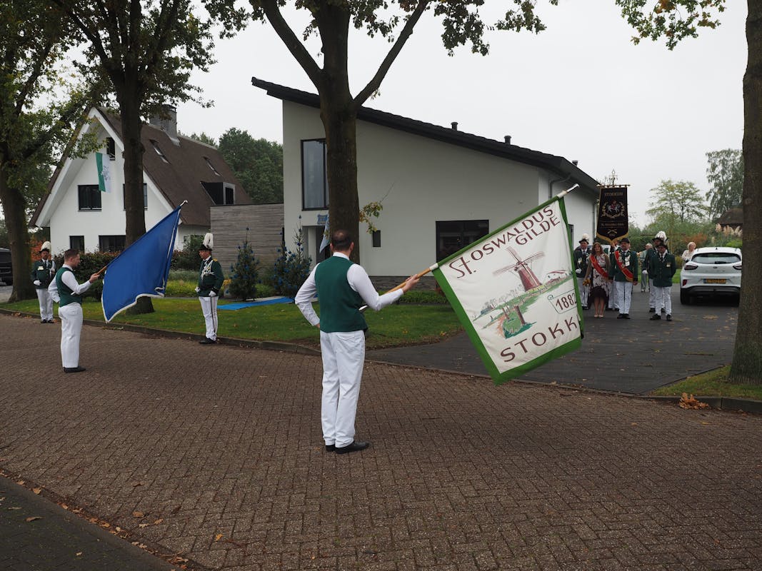 Vanmorgen om 09:30 werd het Koningspaar met veel ceremonieel thuis opgehaald door de leden van het Gilde en de Harmonie “Volharding”. Het nieuwe koningspaar genoot zichtbaar van de vendelhulde van de vendeliers van het Gilde. Een mooie start van een weer feestelijke dag in Stokkum.
