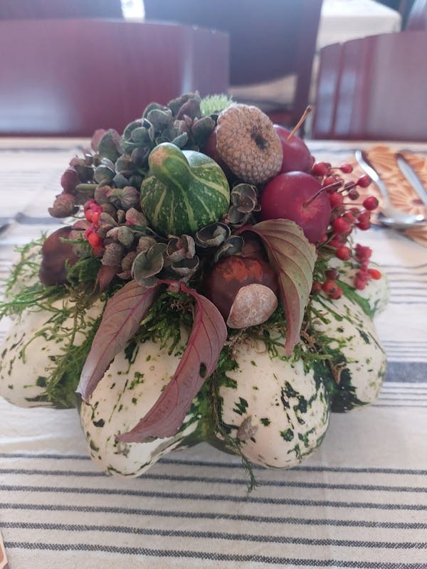 Een magische avond in Stokkum Wat een sfeervolle avond! Het huiskamerrestaurant sprankelt weer met energie, gezelligheid en lekker eten. Achtentwintig gelukkige gasten zitten aan de tafel, omringd door een prachtig herfststukje. Irma Berendsen-Witjes uit het Nachtegaal laantje tovert een pompoen om tot een stralend centrumstuk. Wat een geweldige wijze om bij te dragen aan ons restaurant!