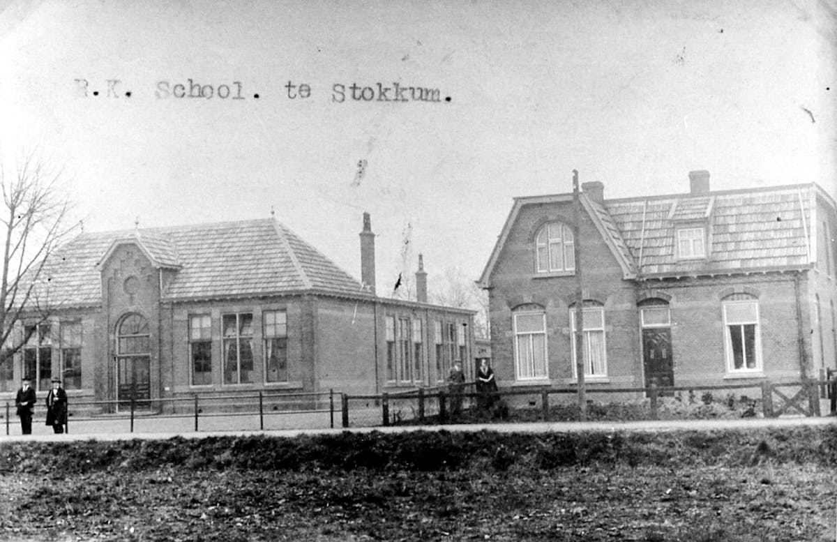 Toen Stokkum zelf nog geen school had ging de Stokkumse jeugd in 's-Heerenberg naar school. Uiteraard werd de schoolweg Stokkum – 's-Heerenberg in die tijd te voet afgelegd. Dit was in de herfst en in de winter uiteraard geen pretje. Op 25 maart 1907 werd er door de inwoners uit de buurtschap Stokkum een brief aan de gemeenteraad Bergh gericht met het verzoek om toestemming voor de bouw van een eigen school. Op 9 april 1907 besluit de gemeenteraad van Bergh tot de bouw van een school in Stokkum. Op 30 april 1907 gaan de Gedeputeerde Staten van Gelderland met dit raadsvoorstel akkoord. In 1908 kon Stokkum over een eigen school beschikken waar openbaar onderwijs werd gegeven. Zie de ansichtkaart met het eerste schoolgebouw en het meestershuis (die er nogsteeds staat). In 1923/'24 werd het een rooms-katholieke school. Op 1 mei 1924 werd de school aan het kerkbestuur overgedragen. Het kostte de kerk totaal 18.000 gulden. Het gebouw kostte 12.600 gulden de meubelen moesten 1.900 gulden opbrengen en de resterende 2.500 gulden kwamen onder de noemer overige kosten. De onderwijzers woning werd voor een bedrag van 3.025 gulden in 1938 aangekocht. Voor de overname door het kerkbestuur werd de school en de onderwijzerswoning grondig opgeknapt.