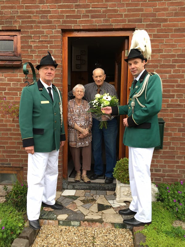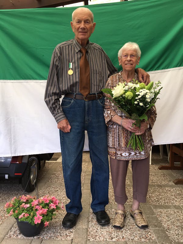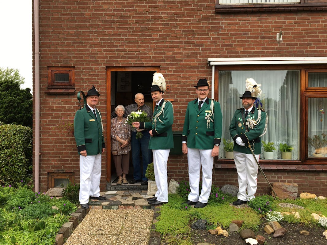 Zaterdagochtend kreeg Willy Gerritsen, met 88 jaar de oudste schutter van het Gilde, een onderscheiding overhandigd voor 70 jaar lidmaatschap. Bloemen waren er voor zijn vrouw Riet.