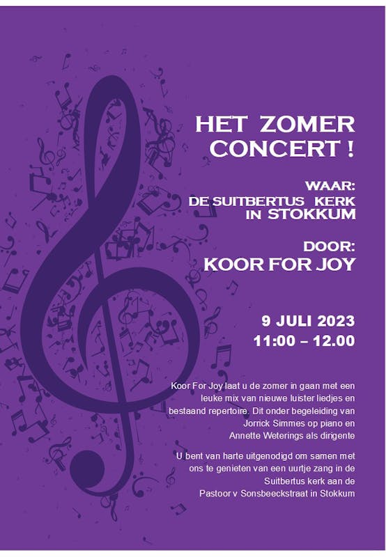 Op zondagochtend 9 juli organiseren wij ons zomerconcert. Met een mooie mix van nieuwe luisterliedjes en bestaand repertoire geven wij de gasten een mooie start van deze zondag.