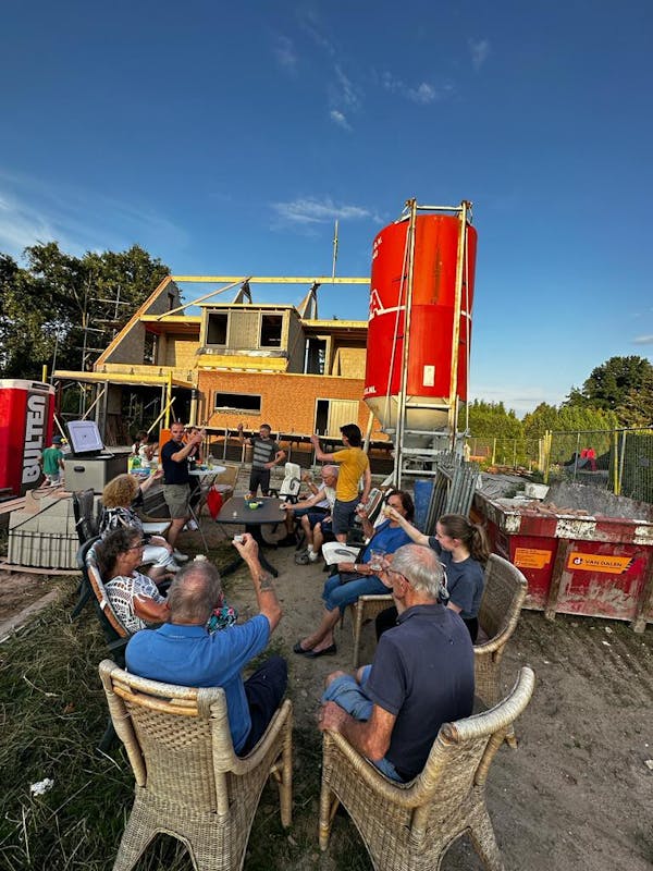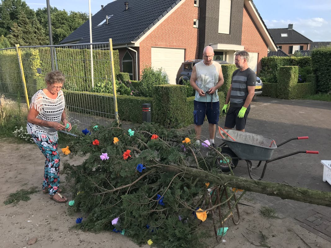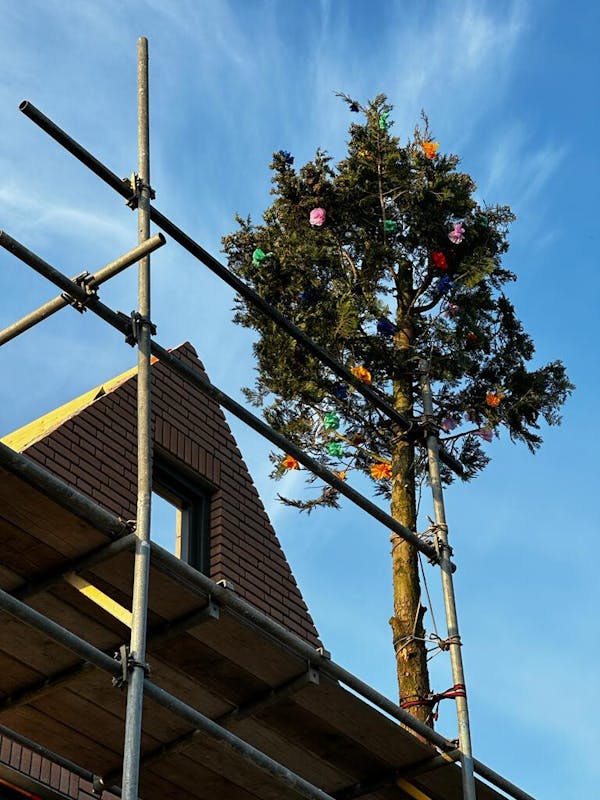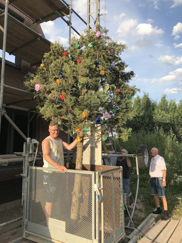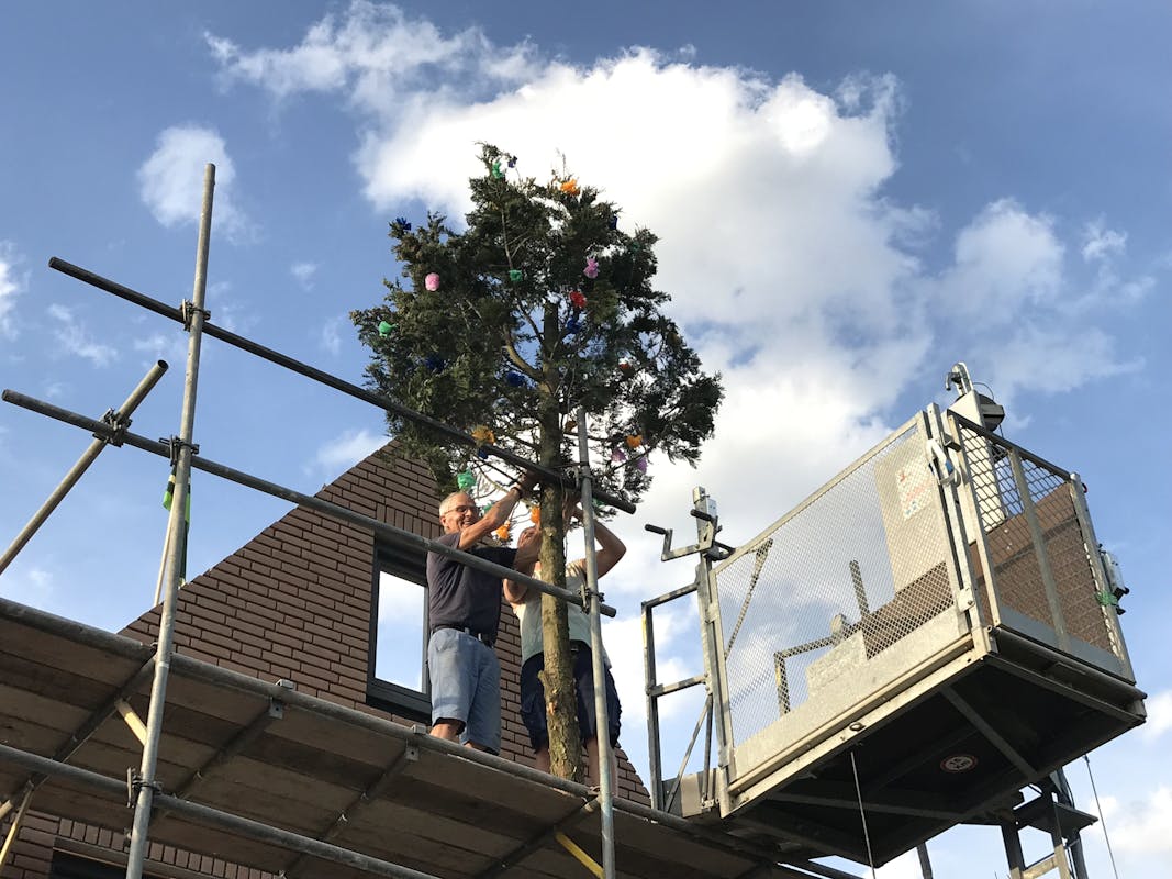 De woning van Marloes ten Oever en Rick Speijers aan de Hagelcruijsweg 14 heeft het hoogste punt bereikt. Reden voor de buren om dinsdagavond een meiboom te plaatsen. Nadat de boom was voorzien van de nodige roosjes werd die met de lift naar boven getransporteerd en vakkundig vastgezet. Daarna was het op deze zwoele avond tijd voor een echt zomers drankje en hief de buurt het glas met een Achterhoekse limoncello.